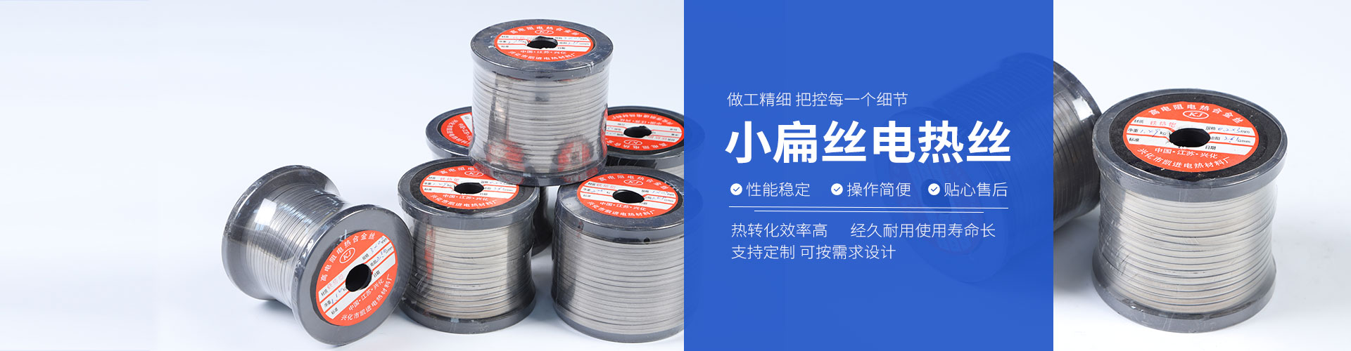公司生產各種規格型號的高電阻電熱合金絲、帶。設計制造各種規格型號的電阻絲、電爐條、電阻帶、石英條。承接各種非標。產品銷往各地,廣泛應用于冶金化工、機械、玻璃、陶瓷及家用電器等領域。地處魚米之鄉的里下河地區,東靠204國道,新長鐵路,西傍229省道。寧靖鹽高速南近328國道。寧啟鐵路。352省道交通便捷。
